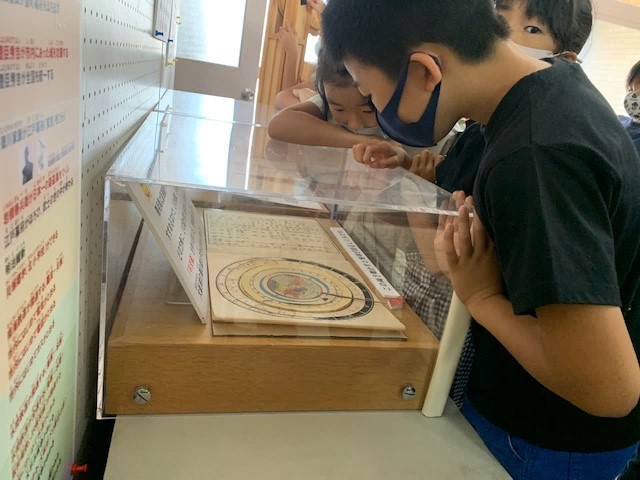 4年前に開催したテーマですが、江戸時代に貝塚で望遠鏡作りを始め、天文学の普及に努めた岩橋善兵衛の業績を改めて知ってもらう機会となりました。善兵衛の著書『平天儀図解(へいてんぎずかい)』と『平天儀』の複製品、天体観測に用いる望遠鏡「窺天鏡(きてんきょう)」の模型を展示しました。多くの児童が実物に近い展示物をのぞき込んでくれるなど、興味・関心の高さがうかがえる巡回展示となっています。