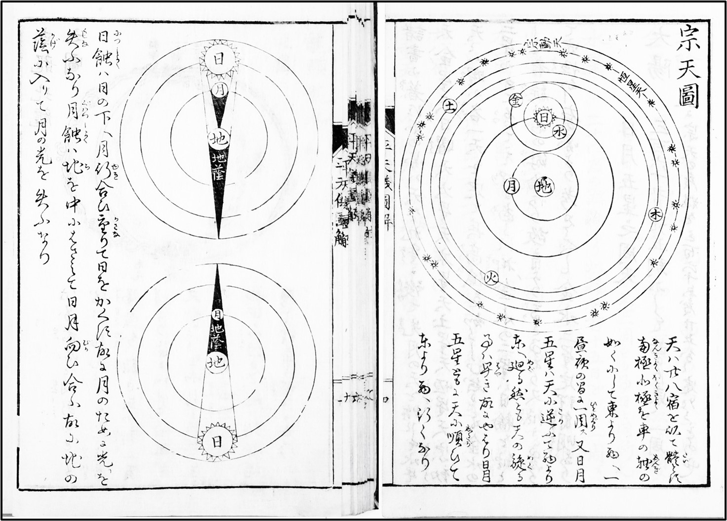 地球と太陽・月・惑星などの関係を図示した『宗天図』(右)と日食・月食のしくみ(左)を解説している。