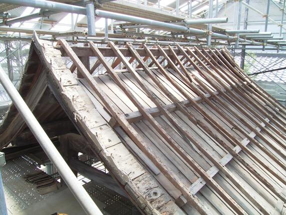 2009年(平成21年)2月より工事用の素屋根という覆屋が建設されました。その後、屋根瓦が全て降ろされ、野地板などが解体されて、2009年4月には、小屋組の見える状態となりました。吊り下げられていた大阪府指定文化財の銅鐘についても、修理中は降ろされて別保管されています。