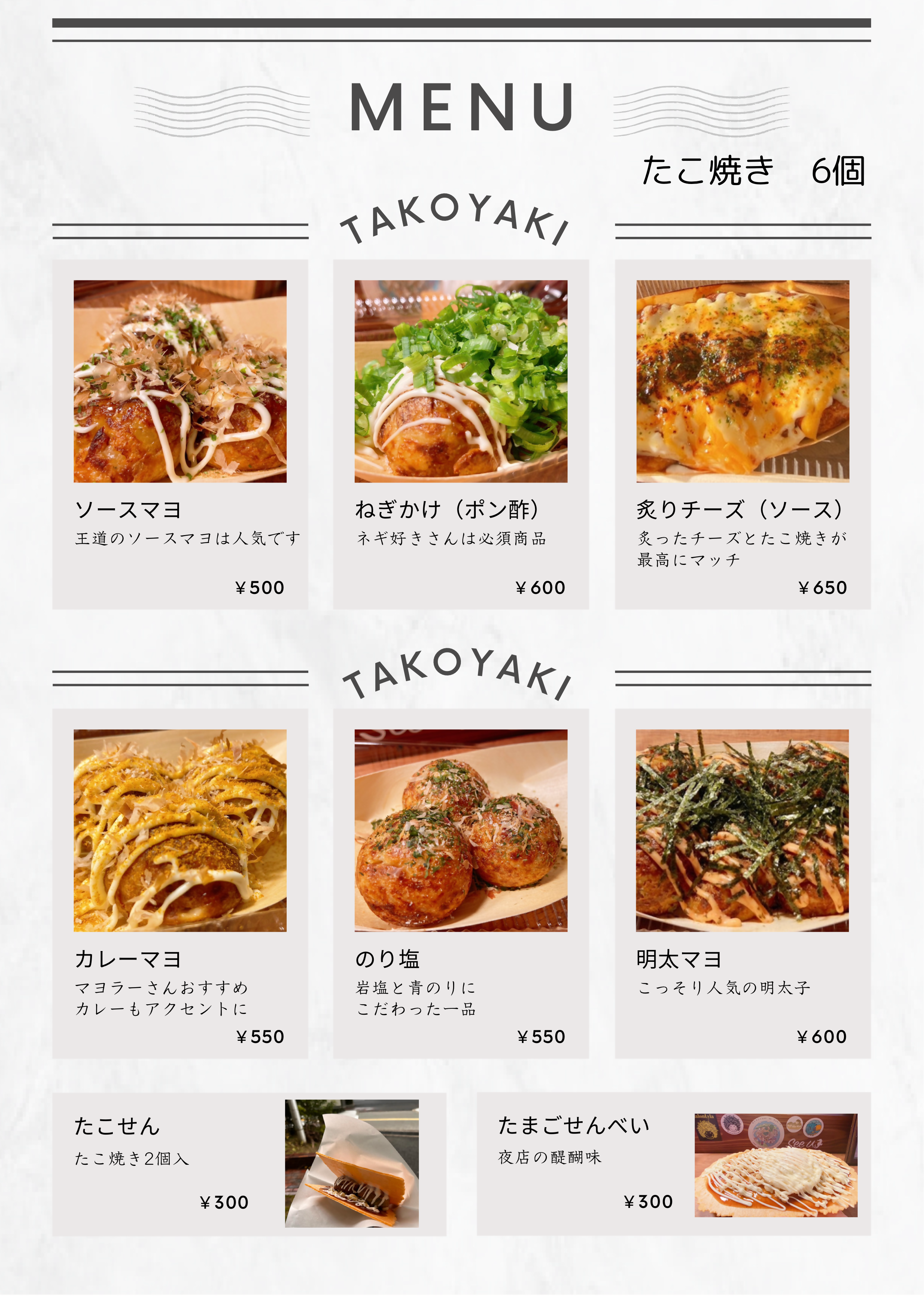 たこやき、たこせん等 | 休 | 営 | 休 | 休 | 休 |